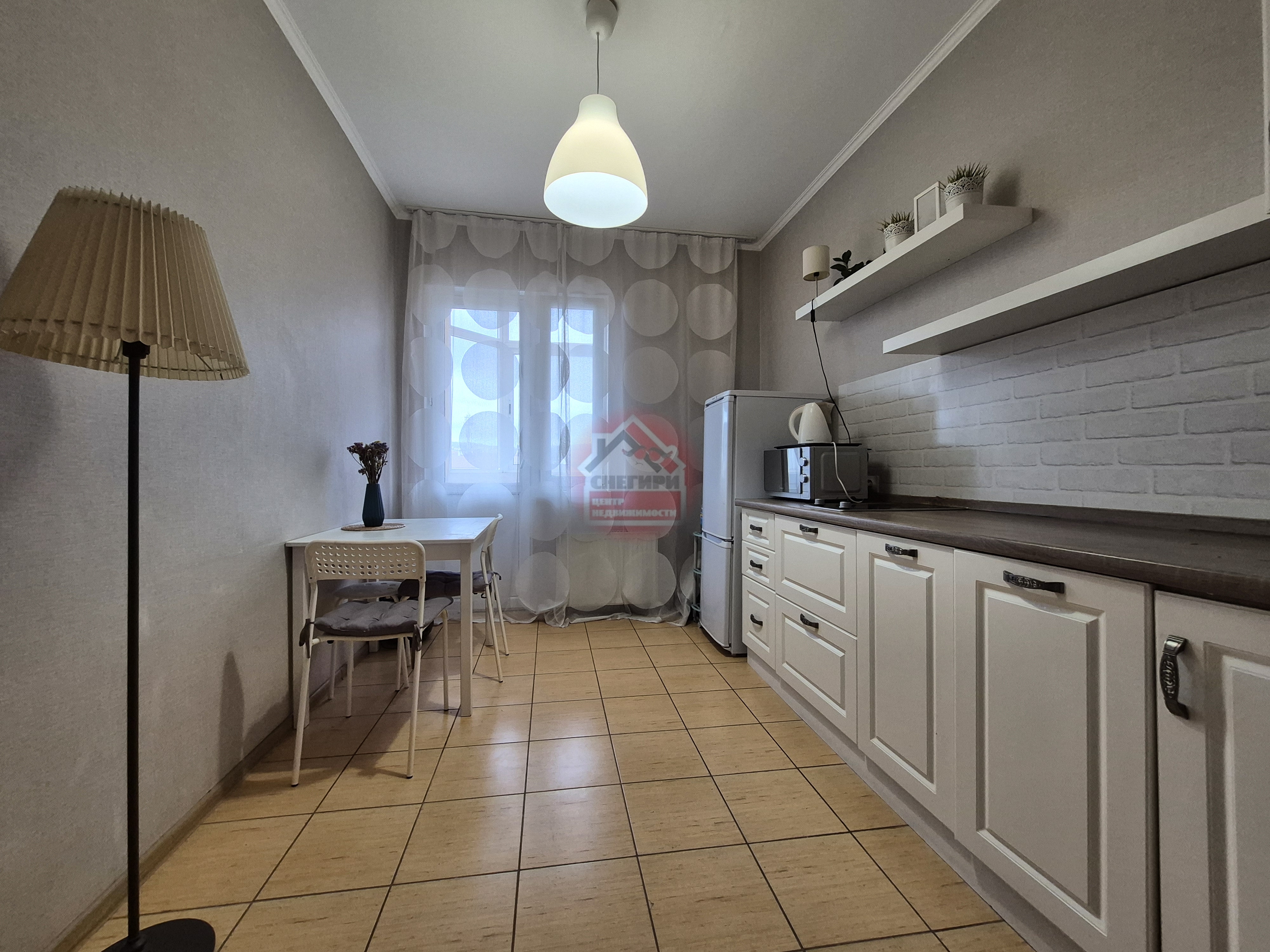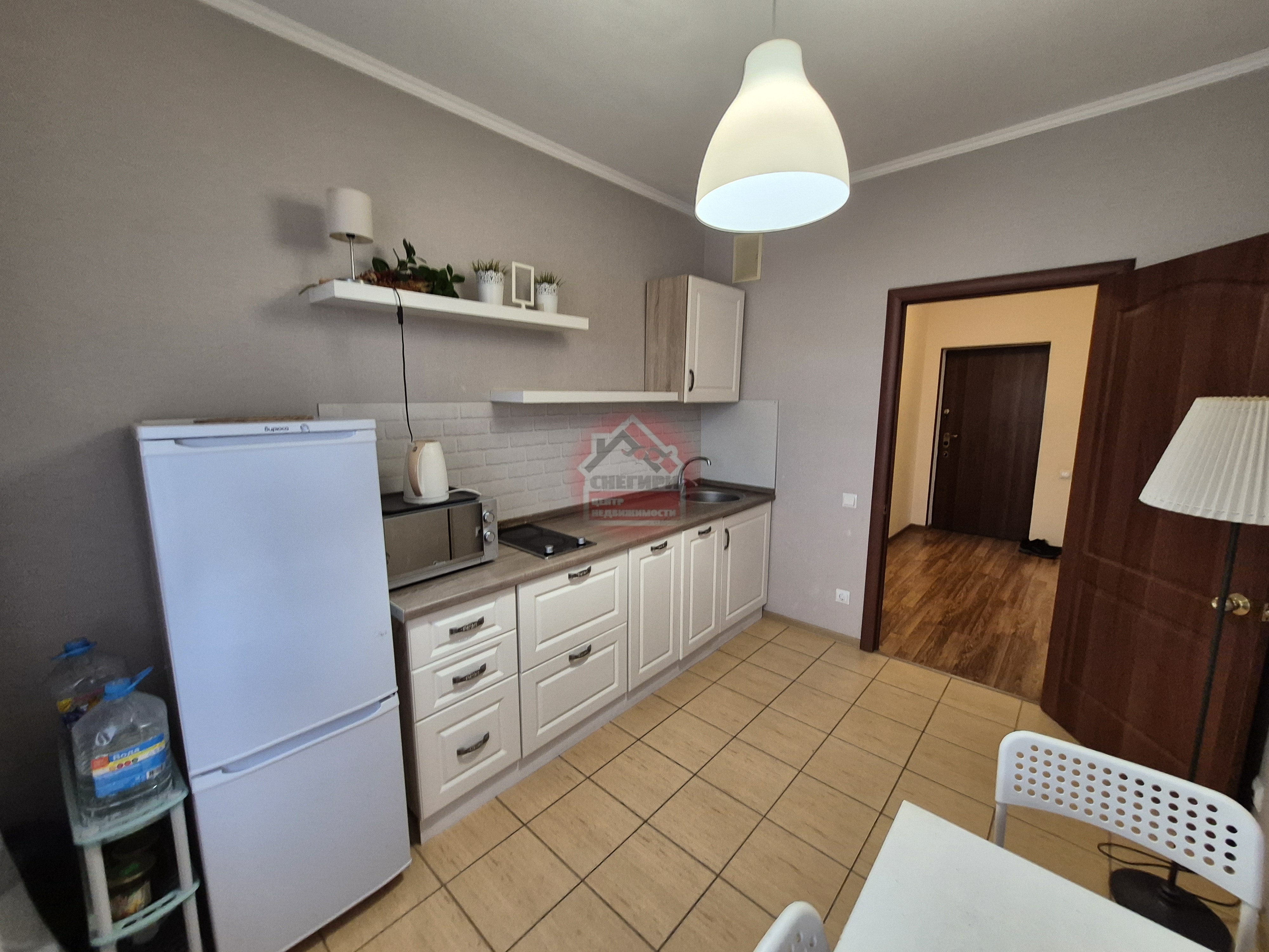 Кухня оборудована современной техникой, включая холодильник, и выполнена в светлых тонах.