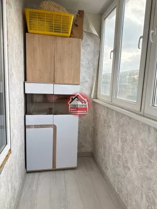 * Балкон: просторный, застекленный, с ламинатом и обоями. Вся мебель для хранения остается!