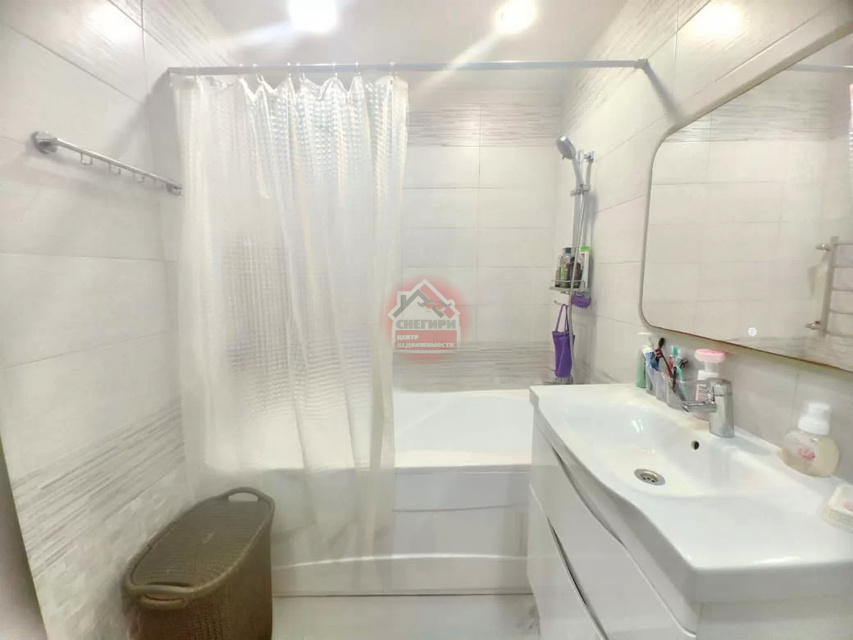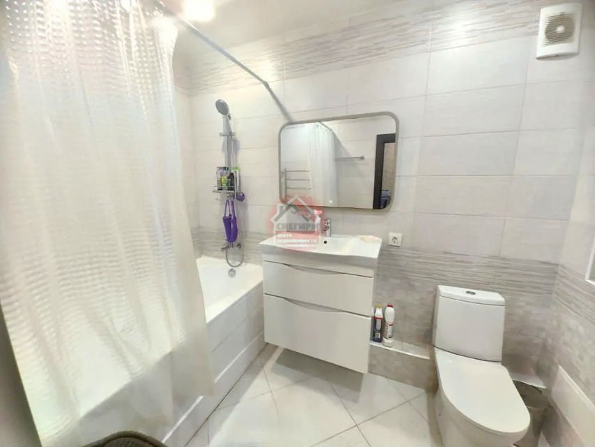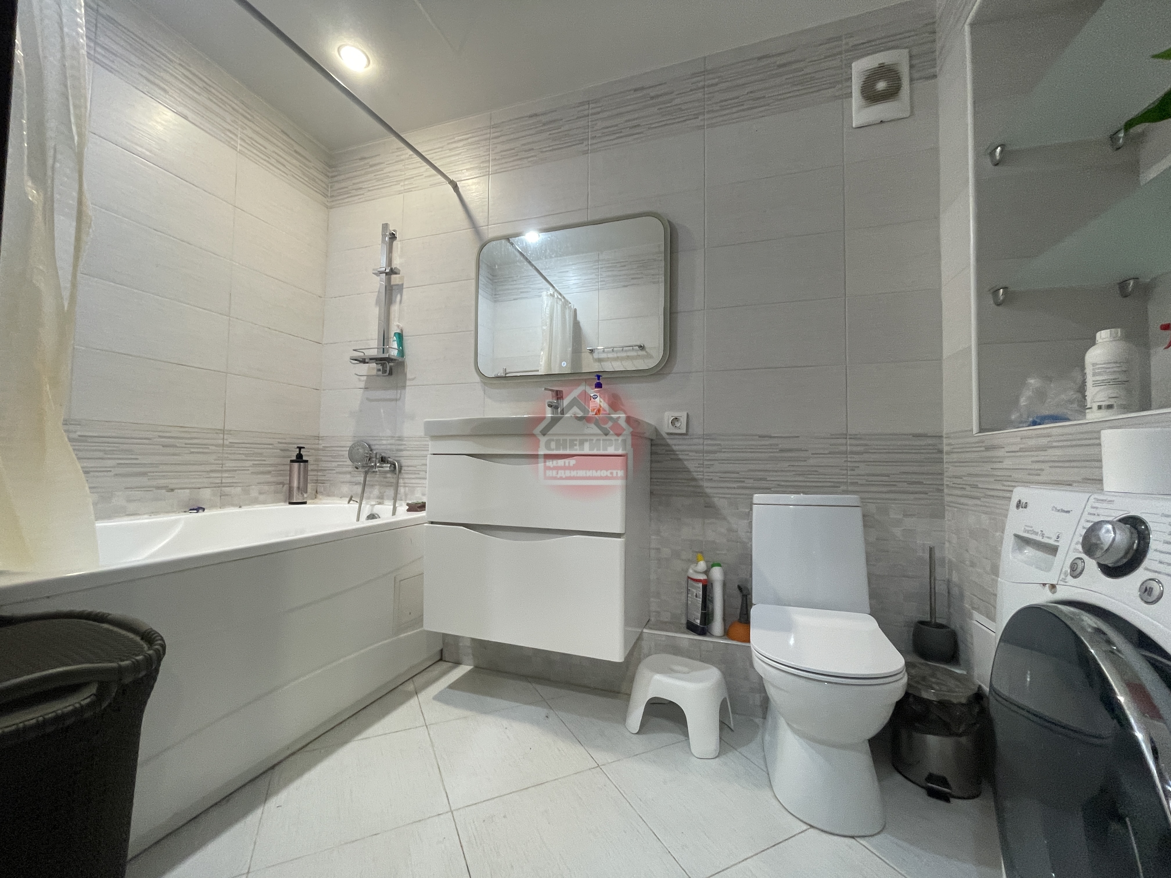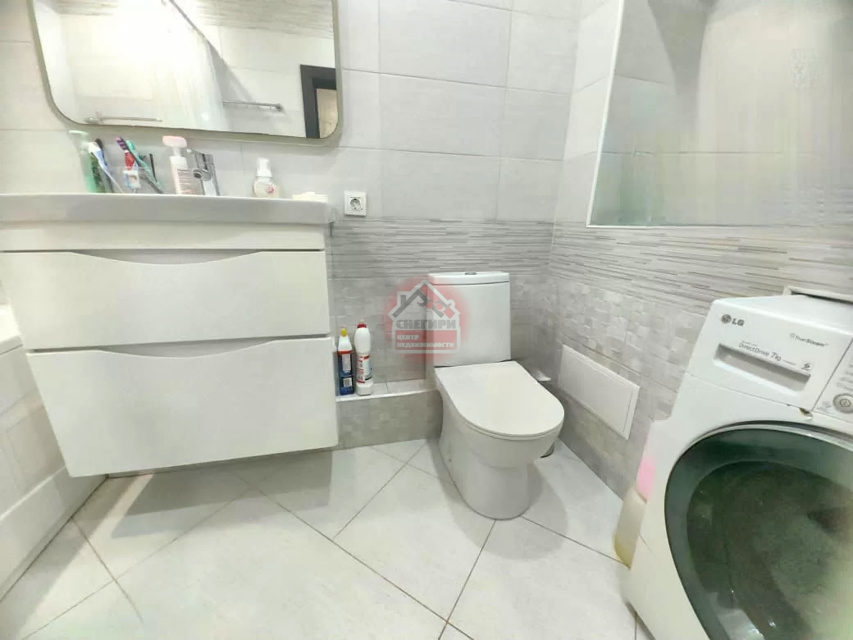 Ванная комната совмещенная, современная отделка, установлена стиральная машина.