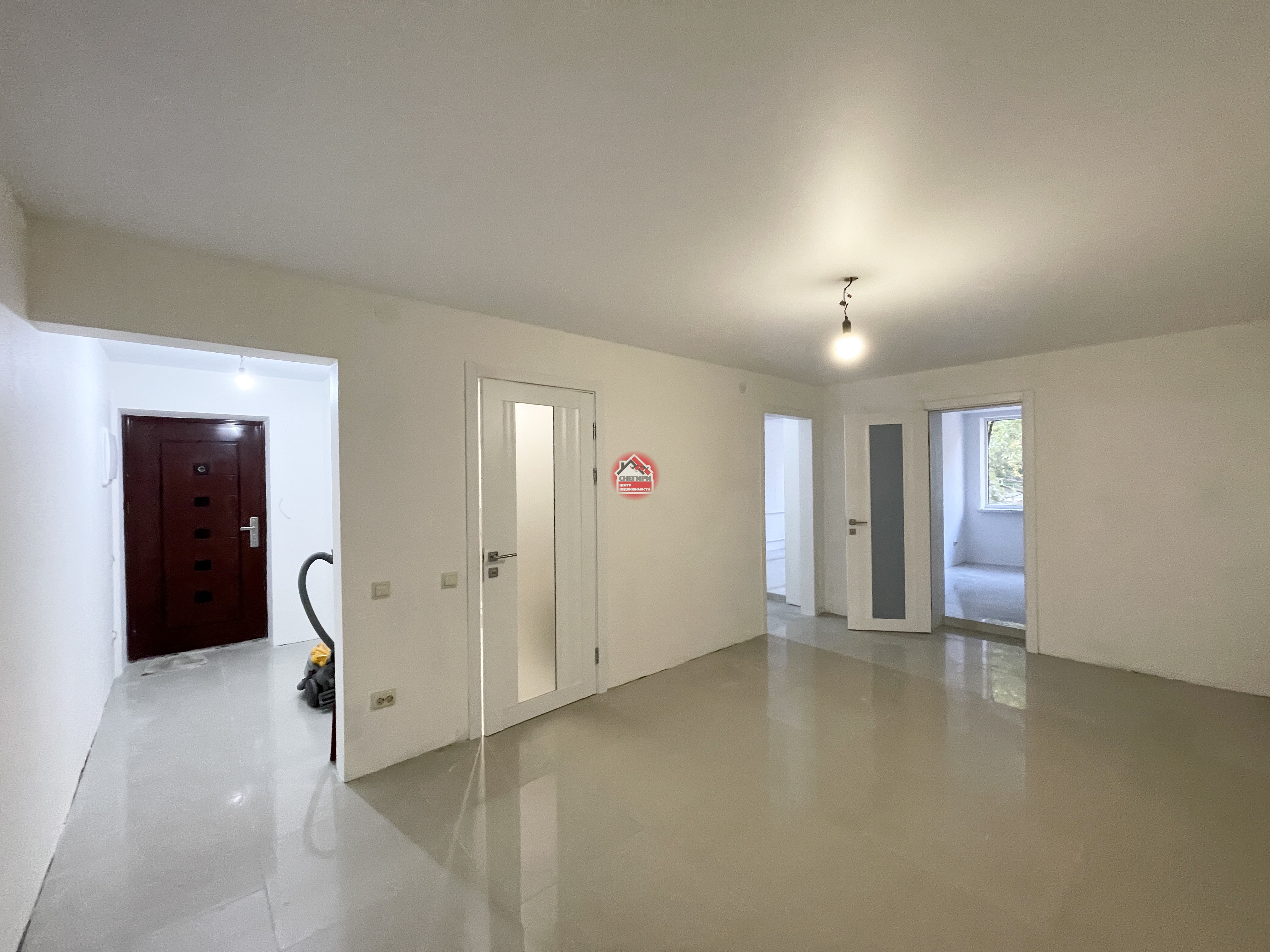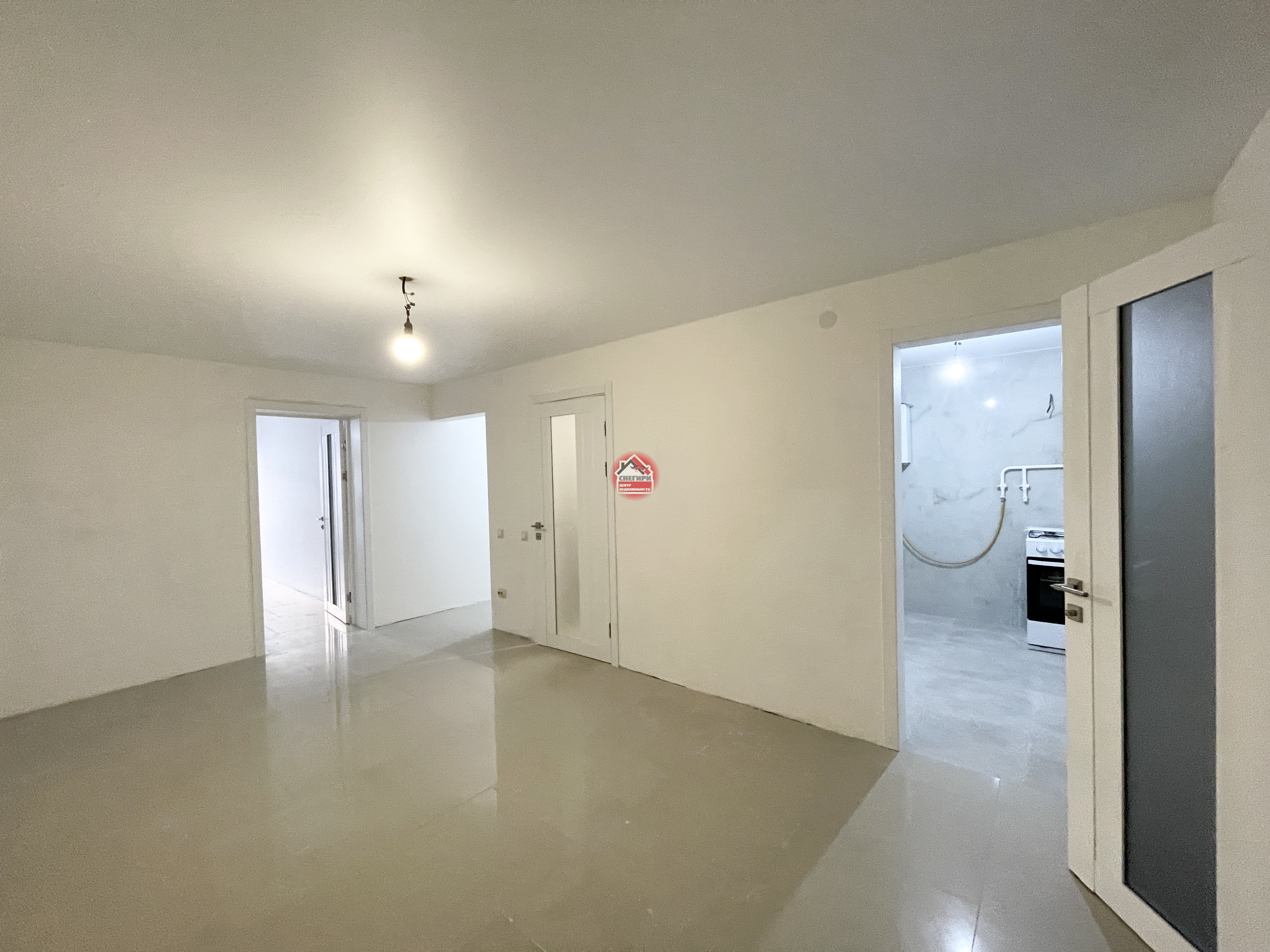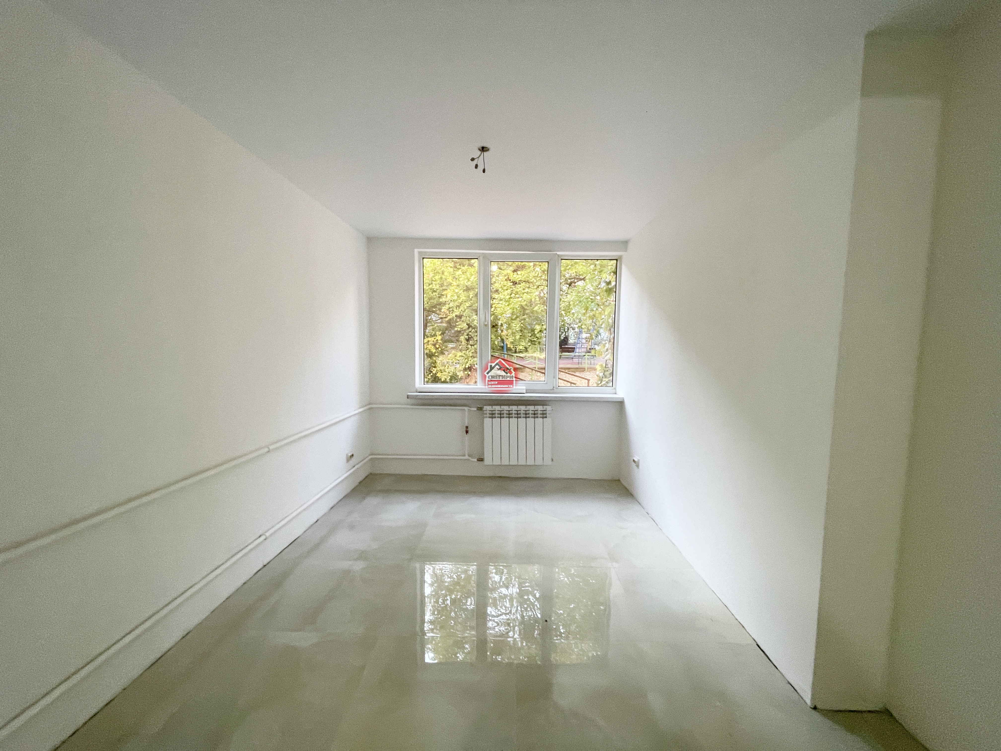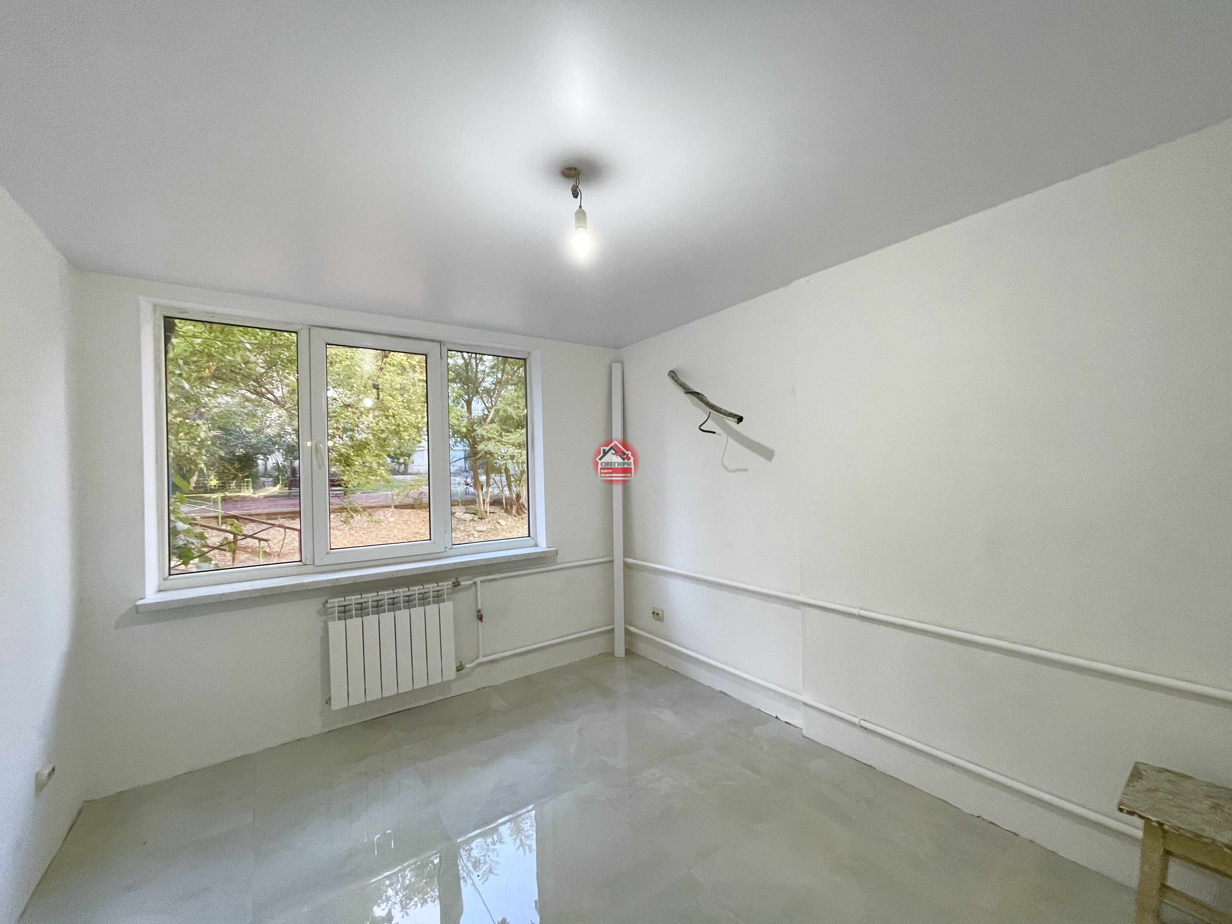Пол керамогранит, стены под покраску, потолки натяжные, окна пластиковые.