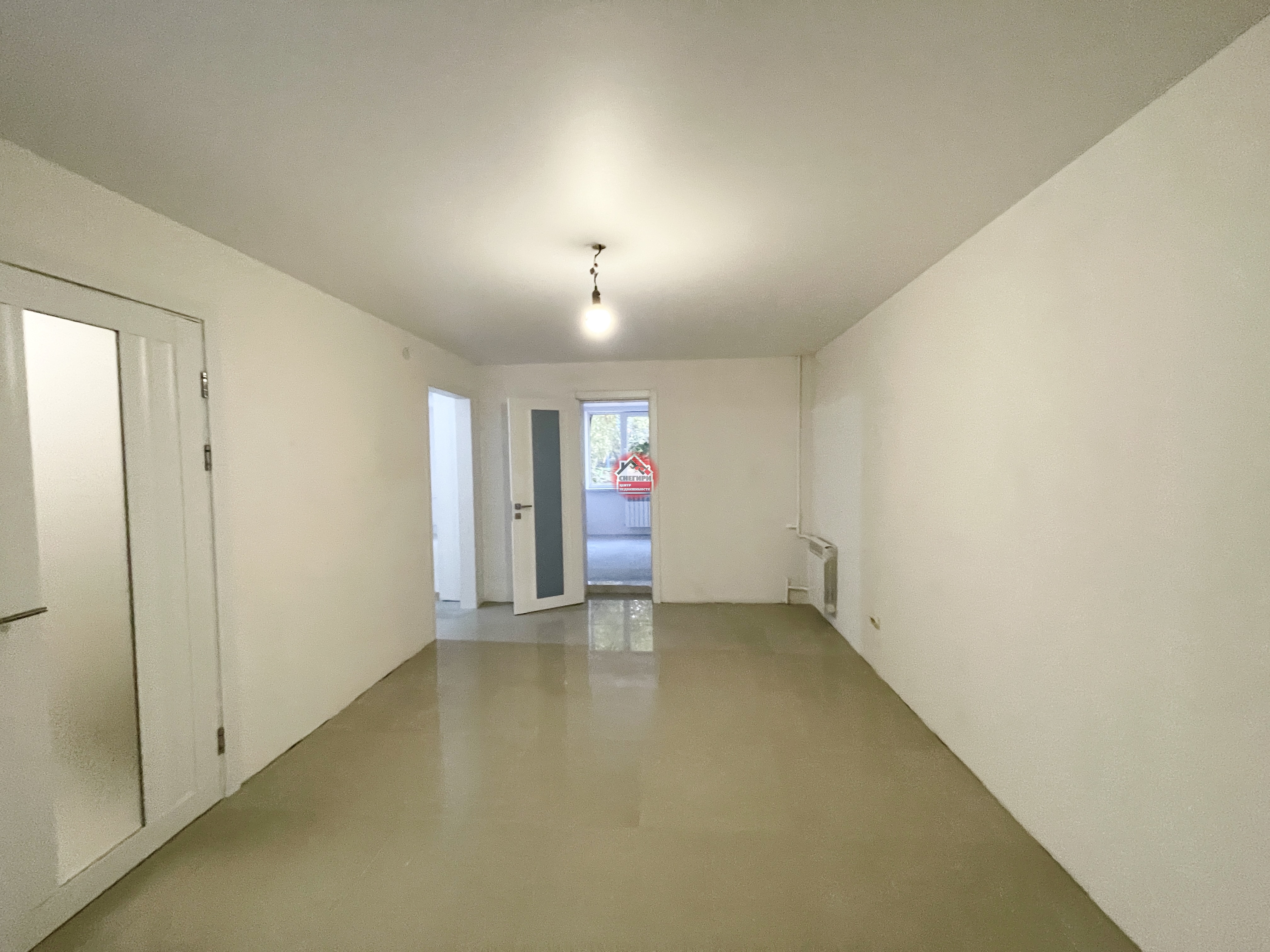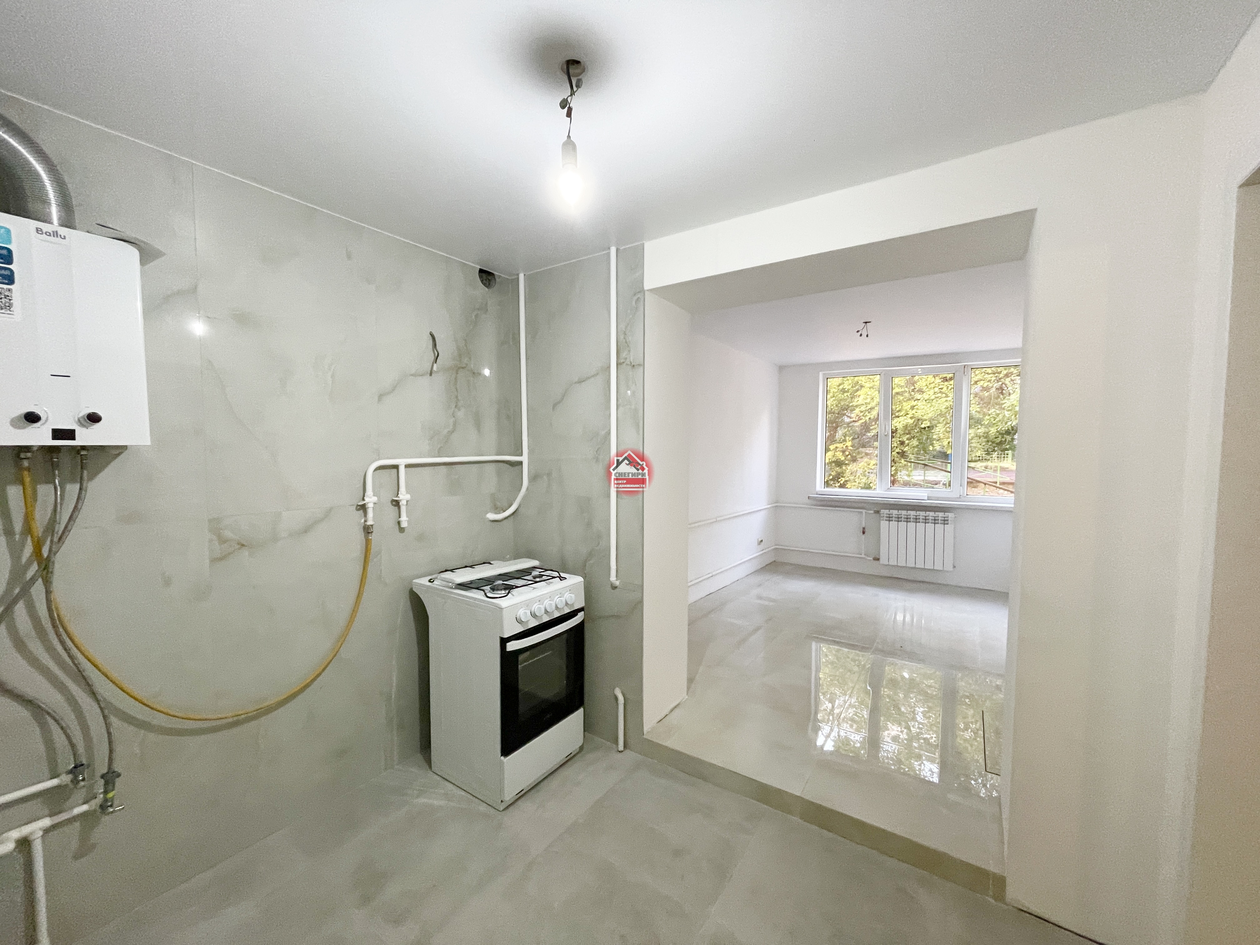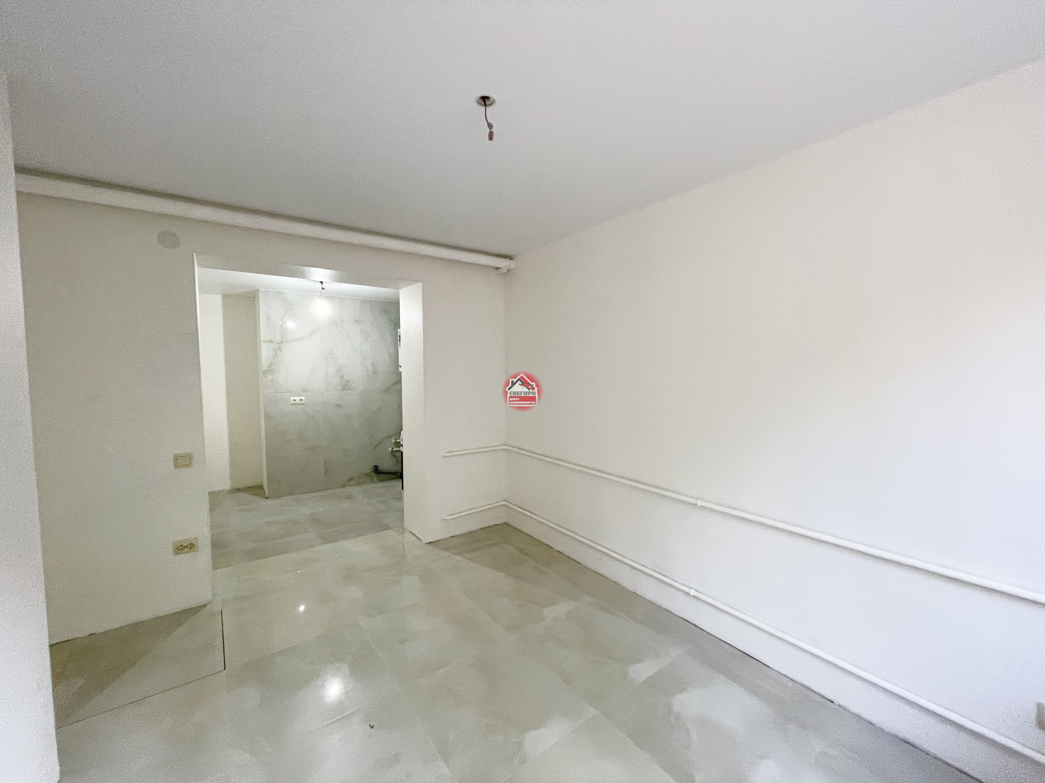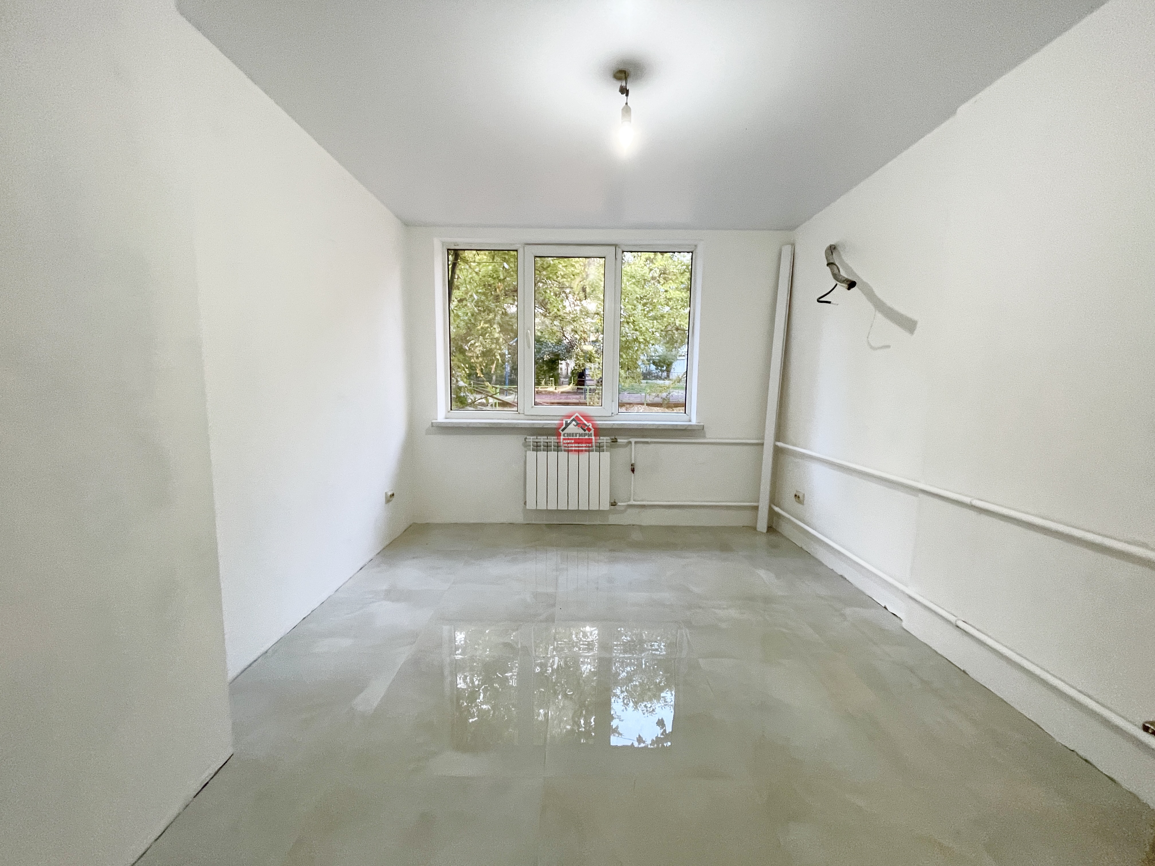 Пол керамогранит, стены под покраску, потолки натяжные, окна пластиковые.