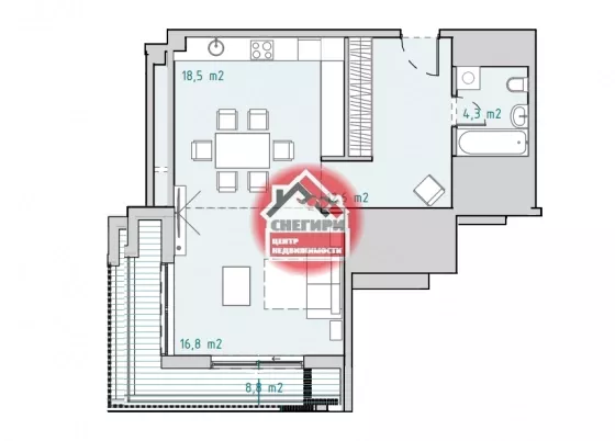 Общая площадь квартиры 61 кв.м., площадь комнаты - 16.8 кв.м., кухня - 18.5 кв.м..