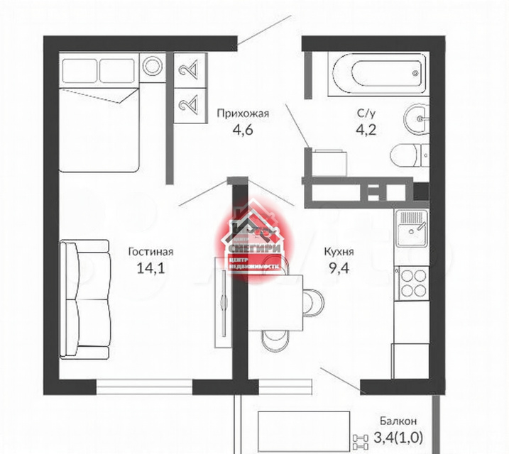 Общая площадь квартиры 33 кв.м., площадь кухни - гостинной - 14 кв.м., комната - 9.2 кв.м., санузел совмещен, лоджия застеклена. Панорамное остекление.