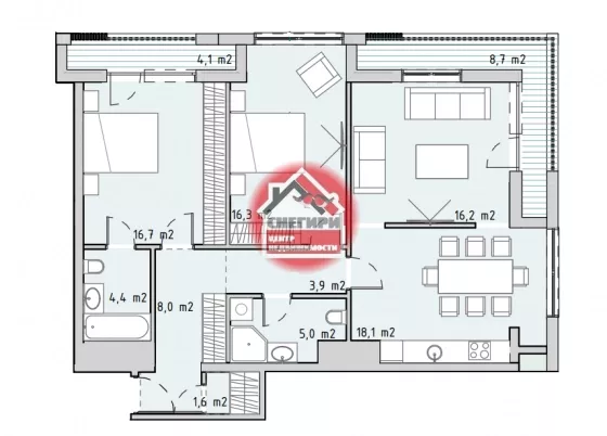Общая площадь квартиры 103кв.м., площадь комнат - 16,7, 16,3 кв.м., кухня - 34 кв.м.,